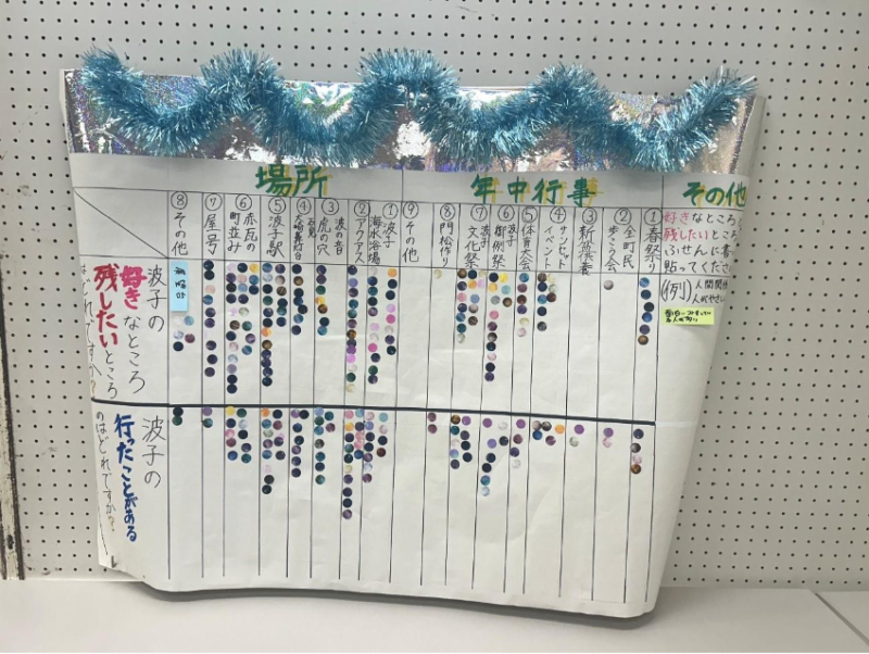 また個人的には、想定していた以上に多くの人が足を止め、迷いながらも一つひとつ丁寧にシールを貼ってくれたことが強く印象に残りました。それは単なるアンケートへの協力というよりも、「自分なりの波子への思い」を形にしようとする行為に見え、波子という町が多くの人にとって大切な存在であることを実感する瞬間でもありました。